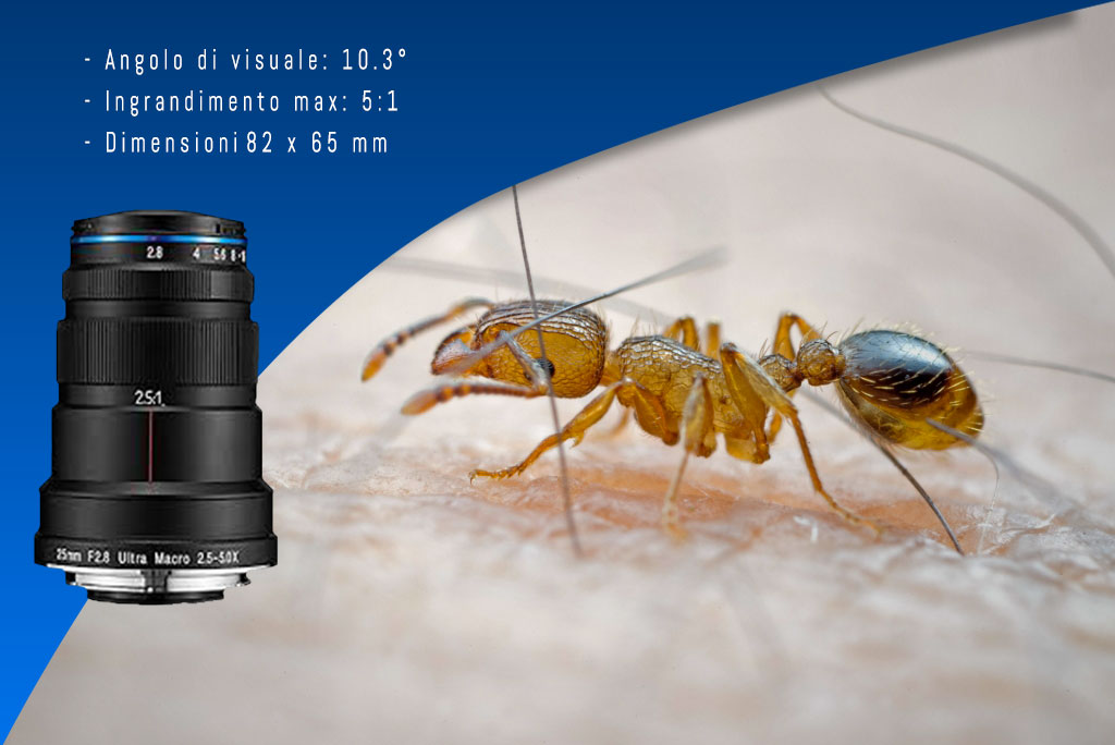 Guardiamo le cose più da vicino! Anche quest’ottica non teme rivali, per dimensioni (82 x 62 mm), peso (400g), lunghezza focale (25mm) e rapporto di riproduzione (da 2:1 a 5:1) lo rendono il più compatto e versatile obiettivo macro presente sul mercato. Ha una distanza minima di lavoro che varia da 45mm a 2:1 e 40mm a 5:1, è un’ottica luminosa (f 2.8), ma sappiamo che per una buona profondità di campo dovremo chiudere il diaframma e, visto anche il grande rapporto di riproduzione, Laowa ha progettato un apposito anello led alimentabile tramite usb che si aggancia sulla parte frontale dell’ottica, oltre ad un collare aggiuntivo con attacco arca swiss.