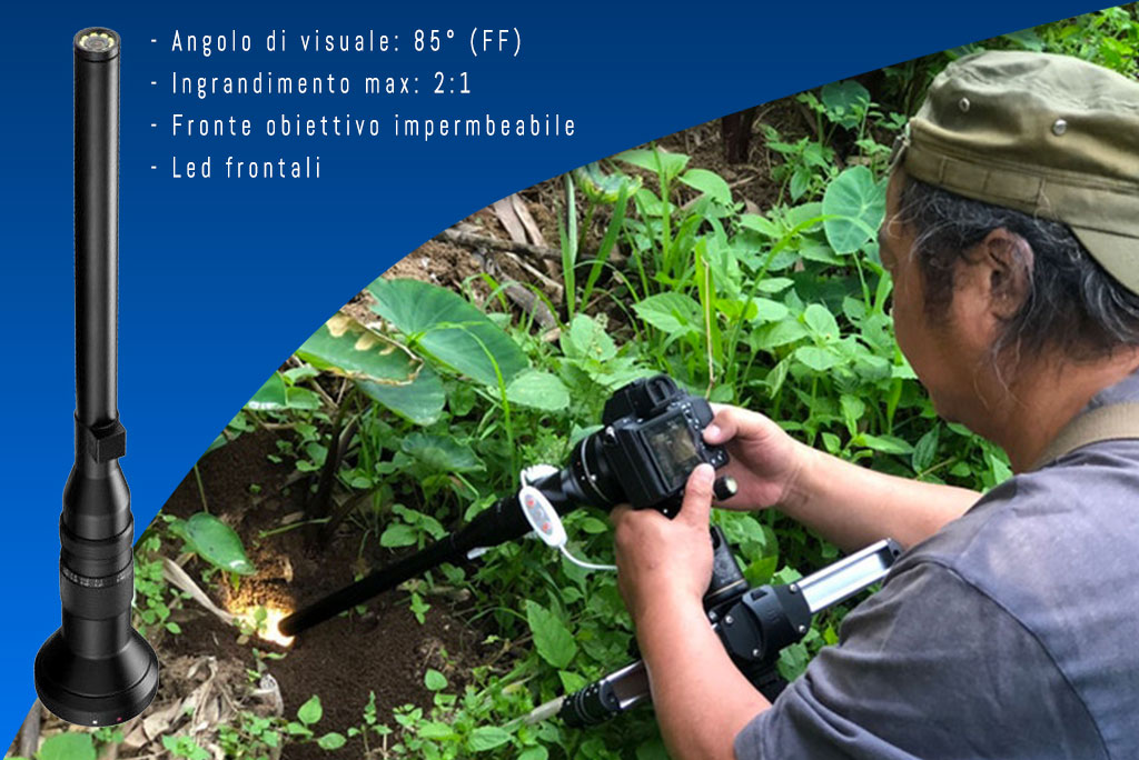 Una forma, un perchè. Rimaniamo nell’ambito di obiettivi grandangolari in grado di produrre macro ambientate, questa lente ha un fattore d’ingrandimento capace di arrivare a 2:1 alla distanza minima di lavoro di 2 cm; la struttura ottica tubolare con un barilotto di 40 cm permette al fotografo la distanza dal soggetto e la possibilità di inquadrature insolite, dulcis in fundo, l’impermeabilità: dalla lente frontale fino a qualche centimetro prima dell’ingresso usb, dal quale si alimenta un illuminatore a 9 led disposto sulla lente frontale. E’ un ottica che ha bisogno di luce, è infatti un f14 alla massima apertura.