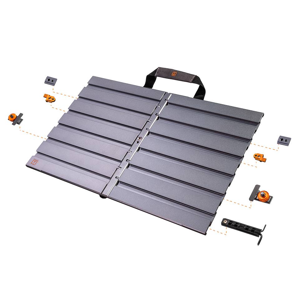 Il sistema Aerotrac è basato su un supporto pieghevole con binari aperti dove è possibile fissare una varietà virtualmente infinita di accessori per il supporto non solo di laptop ma anche di powerbank, luci, ganci per cavi, piccoli contenitori e molto altro.